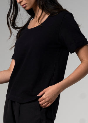 Our 'Deuxieme' T-shirt in textured, mid weight cotton features a stitched roll sleeve and split sides to give multiple options of wearability. The classic, easy to wear round neck style is generous in size, providing a comfortable piece you can wear day in and day out.