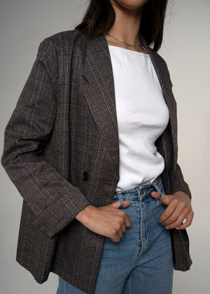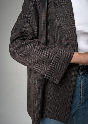 Our Alésia blazer with flapped pockets and double-breasted buttons will give your wardrobe an instant 'Parisienne' update. Made from a cotton blend, the ‘herringbone-check’ coffee coloured print and boxy shape provides a relaxed, tailored, oversized silhouette, comfortable for all body shapes.
