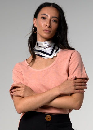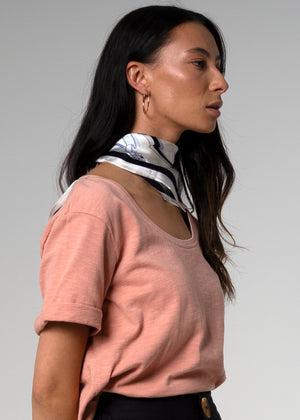 Elevate your ensemble effortlessly with our Cecile silk scarf. Featuring a navy blue, vintage print 'le foulard' can be worn elegantly round the neck in a 'French knot', in the hair or tied onto your bag for a that extra 'nonchalant' style.